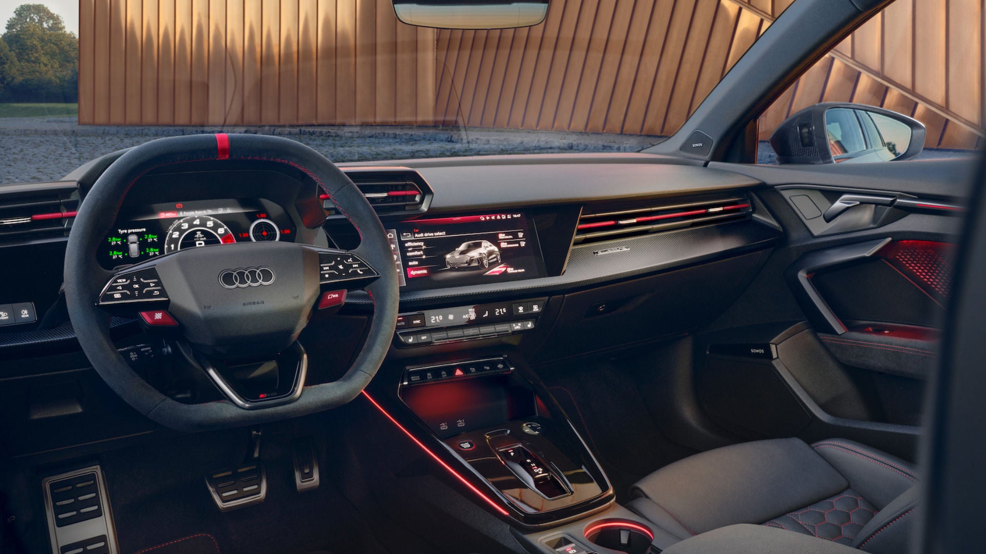 Audi RS 3 Sedan 搭配 SONOS 3D premium sound system 音響系統。15 支高性能揚聲器,包括重低音,每處細節都能真實還原,高音清澈、低音深邃,讓音樂體驗昇華至全新境界。